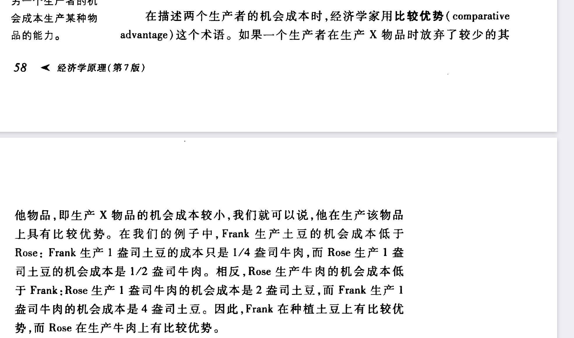这点主要阐述在后续的两个观点,也就是比较优势和机会成本。这个原理是一个在经济学特殊的思考角度,也就是成本除了从你所付出的生产成本(时间、生产资源)之外,为了这个东西所放弃的成本也是这个东西的成本。
