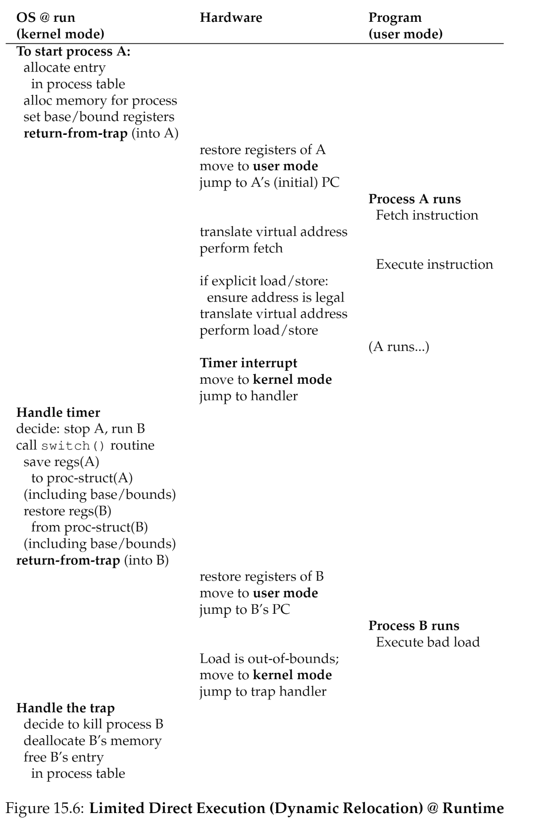 - 某个进程获取内存时,由OS通过内存的free list(暂时理解为一个记录空闲内存的列表),在物理地址中选取一块区域分配给进程,然后因为当前在内核模式,可以直接去修改寄存器中的base为内存物理地址的开始地址,bound为分配给进程的这块内存的大小