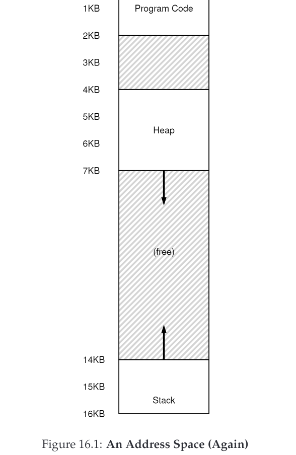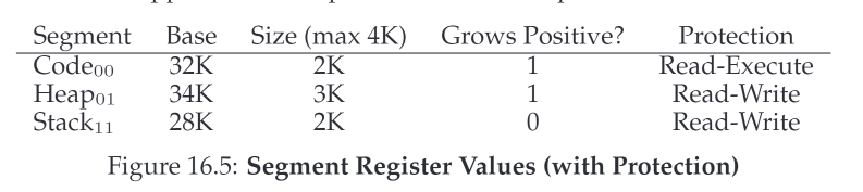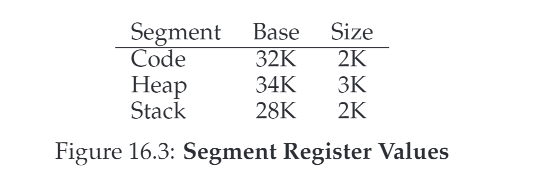 如图文中16.1中表示的这样,实际也就是可以认为这三段在虚拟内存的逻辑上也完全可以是不连续的,这样可以提高虚拟内存地址空间的使用效率。结合一个base+bound表16.3以及16.1,我们来看下这种方式如何运作