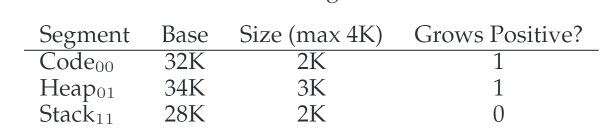 这样让我们来计算一下这种情况下stack的实际物理地址。当我们想要访问虚拟内存的15k时,实际对应的是物理地址的27k。在我们的显示标记表达法之下,转换的地址值就是: 11 1100 0000 0000 (hex 0x3C00),其中前2位11表示了这个段的类型是栈,然后剩下的偏移量3k,我们通过3k-4k(因为是负向增长,所以需要减去偏移范围最大值才是实际的偏移)得到-1k,此时对应的物理地址28k直接+上面得到的-1k就得到了实际的物理地址27k。