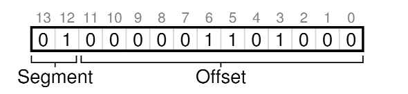 其中起始的2位01表示是Heap段,后续的12位即000 0110 1000, 就是我们计算的结果104