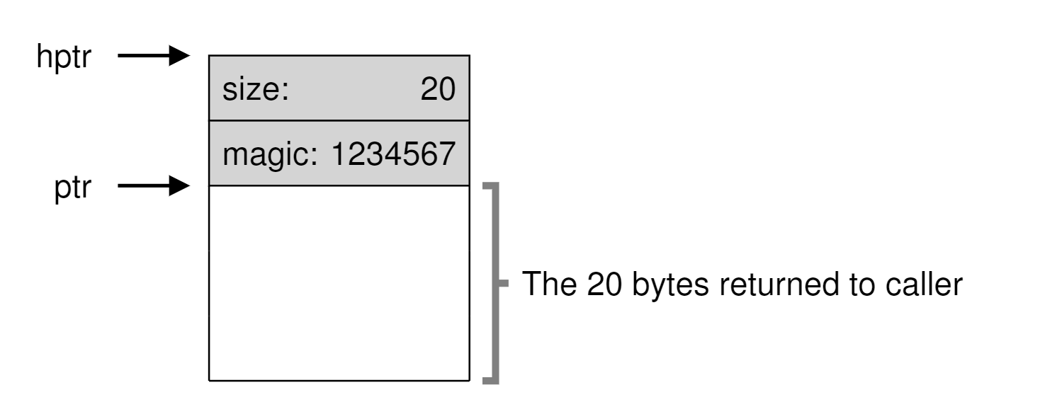 其实从上面那个列表已经可以看出来,每个节点需要一部分额外的空间作为header去描述这部分内存的大小,简单来说就是一个size和一个magic。其中size就描述了这段内存的大小。magic作为魔法值用于完整性的校验(大抵是供内存库来校验这部分是否是它自己分配的?说实话不太懂要来校验什么)。那么在使用free来释放内存时,我们自然可以通过传入的指针马上拿到这部分的大小,来快速完成内存的释放(把这部分内存加入回free list里)。当然,这也使用了额外的一丢丢内存来储存这个header,所以在实际搜索位置去分配的时候的时候,如果用户要求20byte,那你要搜索到实际空闲的22byte才可以完成这个内存分配。