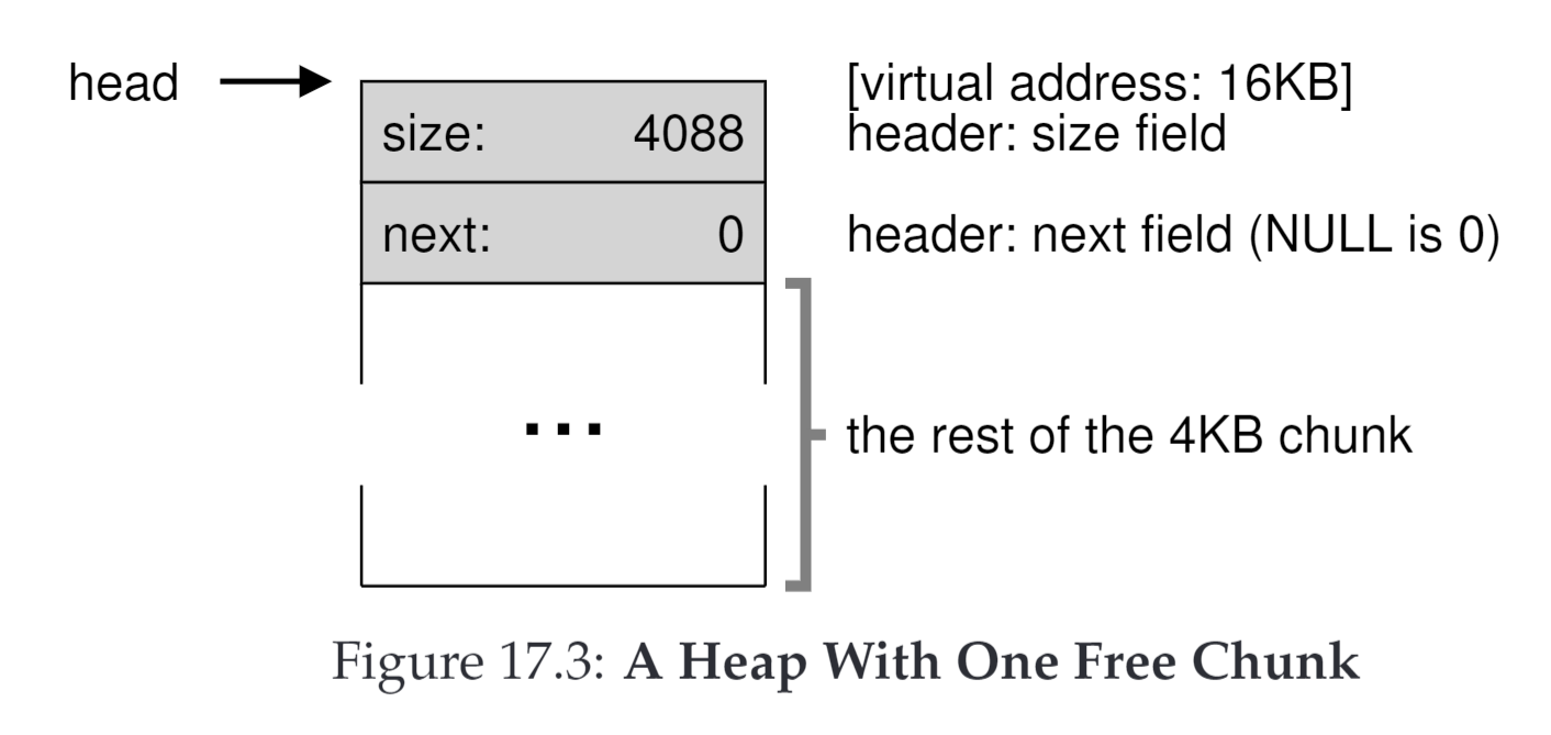 首先,我们认为内存还没分配,这个时候head指针在一开始,我们认为整个free list只有一个节点。