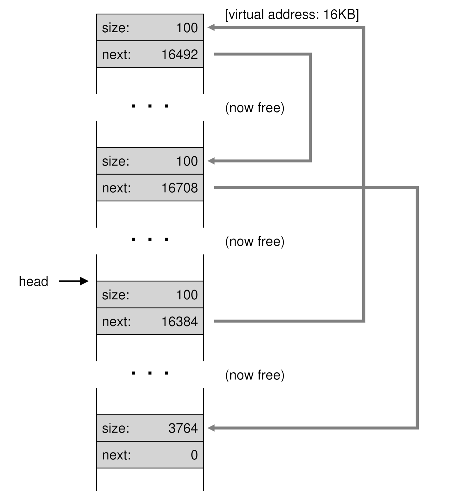 这章主要介绍了空闲内存管理的一些内容,不过要先弄清楚前提,本章的内容是基于段来管理内存并且主要描述的是在管理段的内存时,内存分配库(malloc)或者os需要考虑的一些方面或者设计。有一点需要明确,否则很容易混淆:本章主要讨论的是内存分配库或者os管理某一个段内内存的情况。